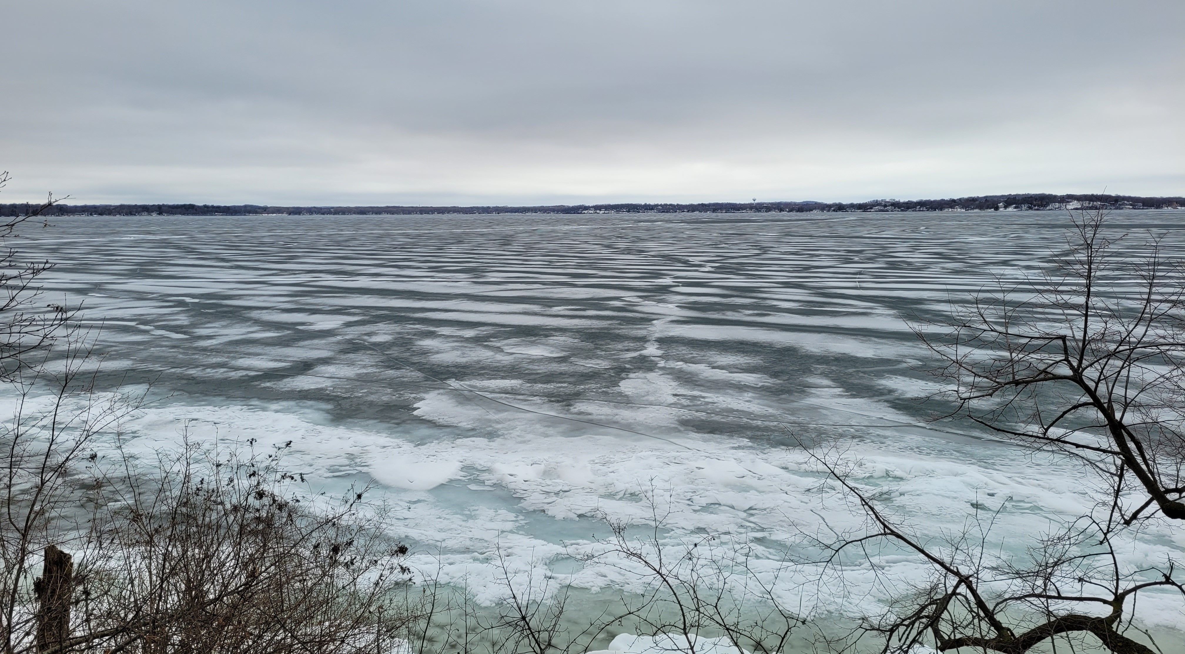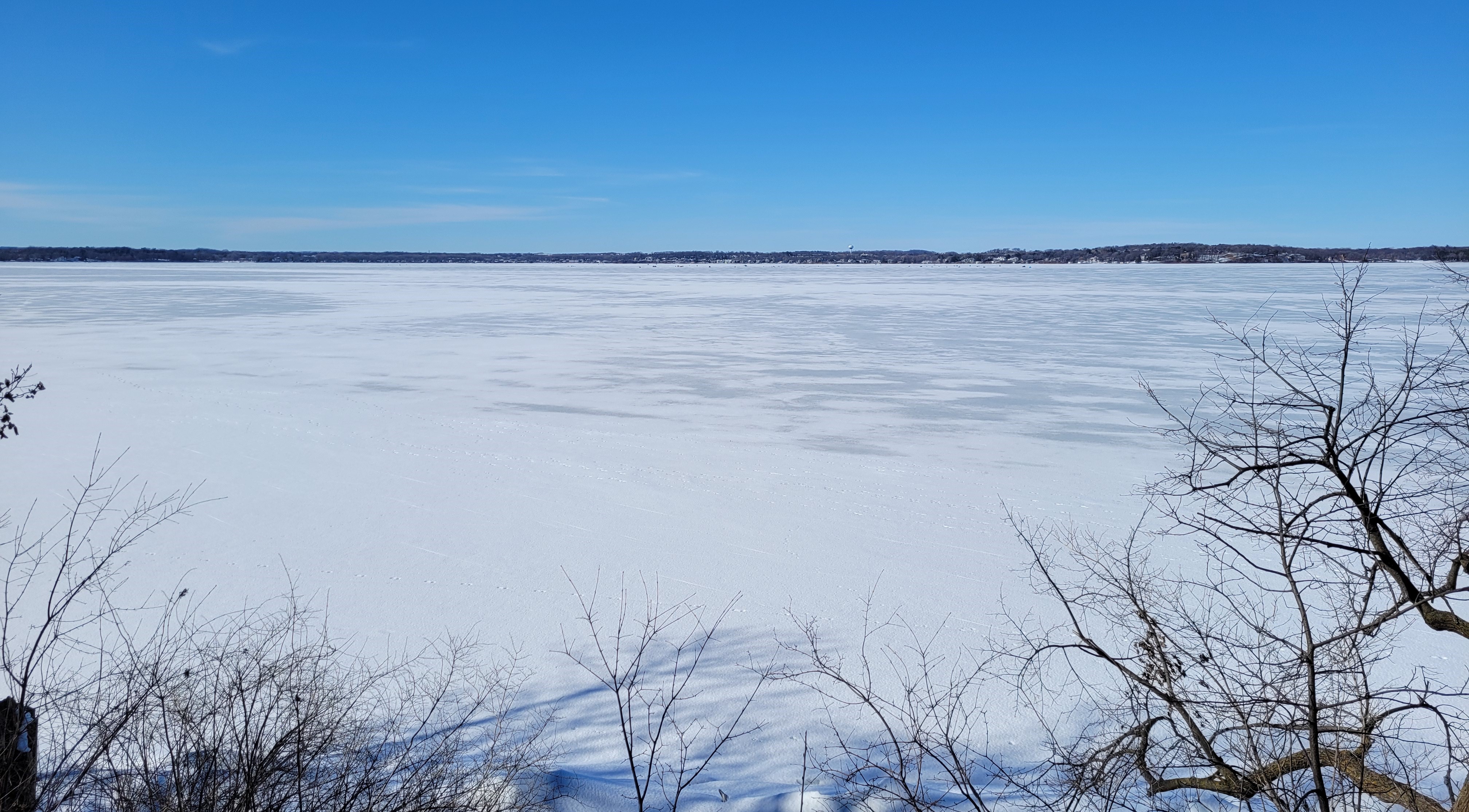 As it happens, my first two winters in Madison gave me a back-to-back comparison of Mendota’s past and future. In 2022–23, ice cover lasted 98 days, close to the average since record-keeping began in 1855. When I traipsed through the snowy woods to the lakeshore on February 11, 2023, I saw at least a dozen ice fishing camps near the center of the lake.